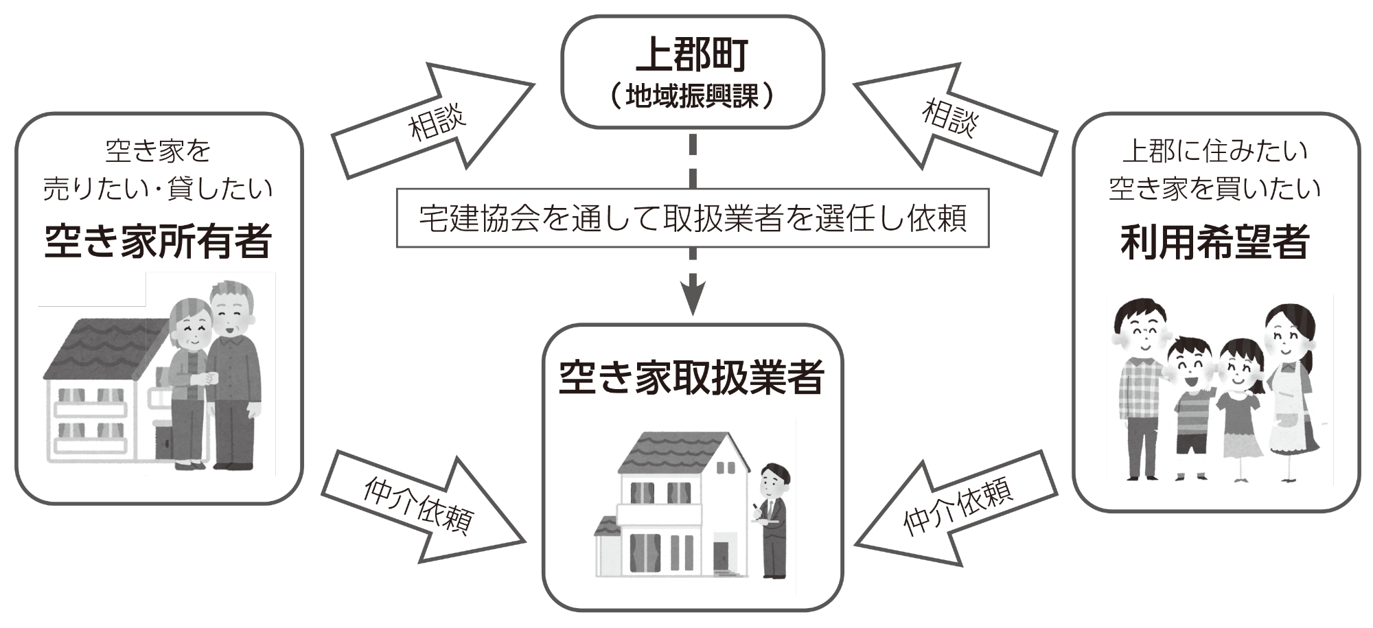 町内の空き家などの売買、賃貸借を希望する所有者から申請を受けた情報を、町内へ移住・定住などを目的として、空き家などの利用を希望する方に対して、町のホームページにより紹介を行うマッチングシステムです。